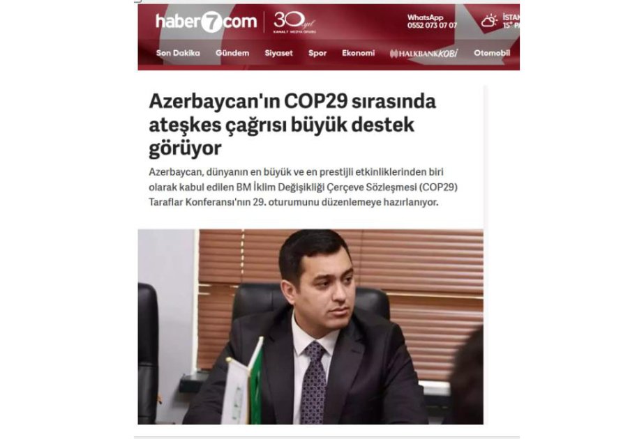 BMT-nin İqlim Dəyişikliyi üzrə Çərçivə Konvensiyasının Tərəflər Konfransının 29-cu sessiyası (COP29) zamanı Azərbaycanın atəşkəs çağırışı bütün dünyada getdikcə daha çox dəstək alır. AZƏRTAC xəbər verir ki, bu barədə Türkiyənin “Haber7” telekanalının Bakıda keçiriləcək qlobal tədbirlə bağlı materialında deyilir.