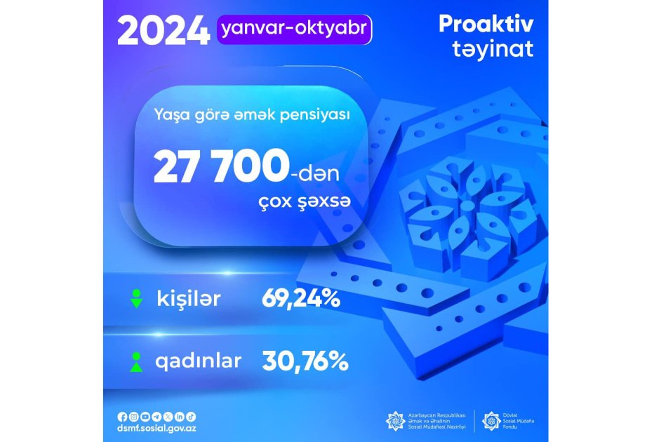 Bu ilin yanvar-oktyabr aylarında 27 min 700 nəfərdən çox şəxsə proaktiv qaydada yaşa görə əmək pensiyası təyin olunub.