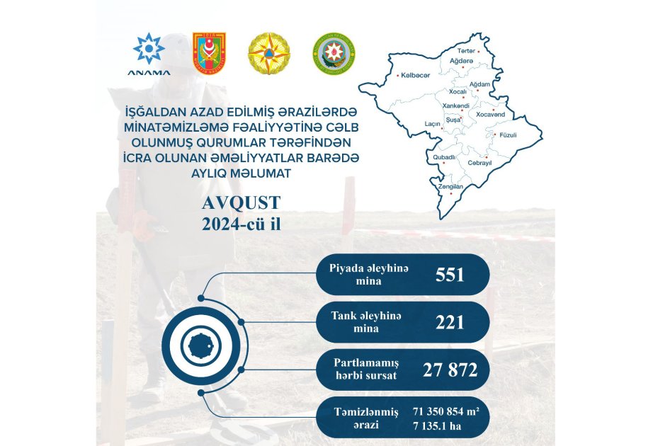 ANAMA-dan AZƏRTAC-a bildirilib ki, avqust ayında Tərtər, Ağdərə, Kəlbəcər, Ağdam, Xocalı, Xankəndi, Xocavənd, Laçın, Şuşa, Füzuli, Qubadlı, Cəbrayıl və Zəngilan ərazilərində aparılmış minatəmizləmə əməliyyatları zamanı piyada əleyhinə 551, tank əleyhinə 221 mina və 27 min 872 partlamamış hərbi sursat aşkarlanaraq zərərsizləşdirilib.