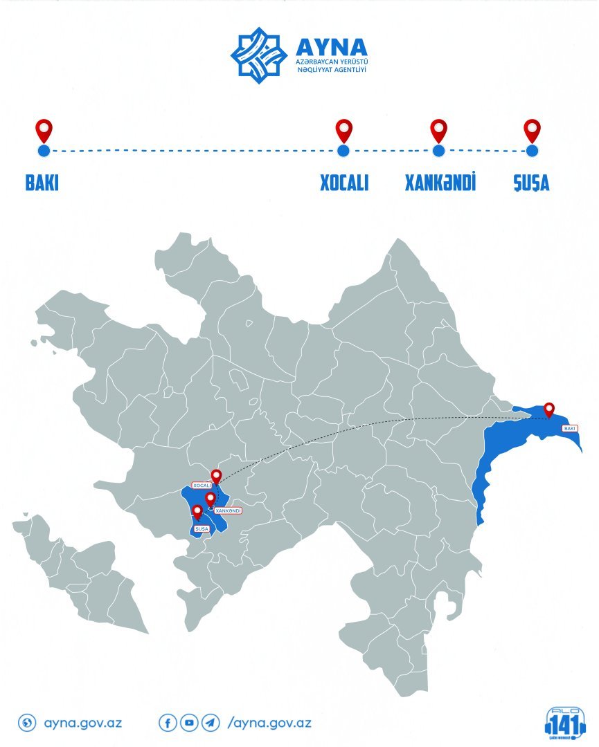 “Böyük Qayıdış” proqramı çərçivəsində Azərbaycan Yerüstü Nəqliyyat Agentliyi (AYNA) tərəfindən sentyabrın 16-dan Bakı-Xocalı-Xankəndi-Şuşa müntəzəm avtobus reysi istifadəyə veriləcək.