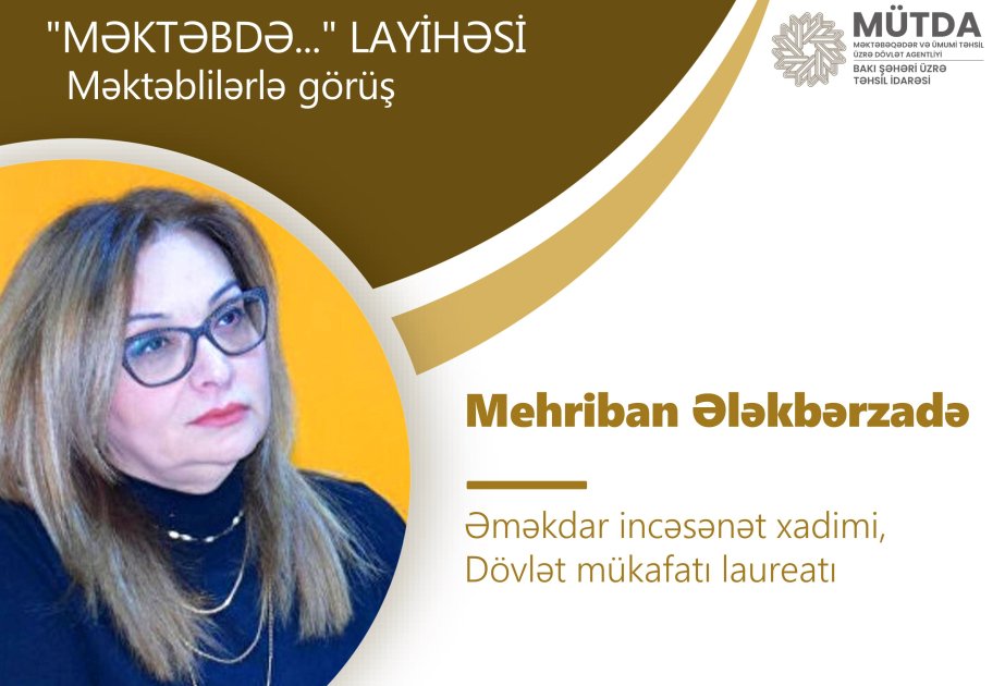 BŞTİ-dən AZƏRTAC-a bildirilib ki, paytaxtdakı 161 nömrəli tam orta məktəbdə reallaşacaq layihənin budəfəki qonağı Əməkdar incəsənət xadimi, Dövlət mükafatı laureatı Mehriban Ələkbərzadə olacaq.