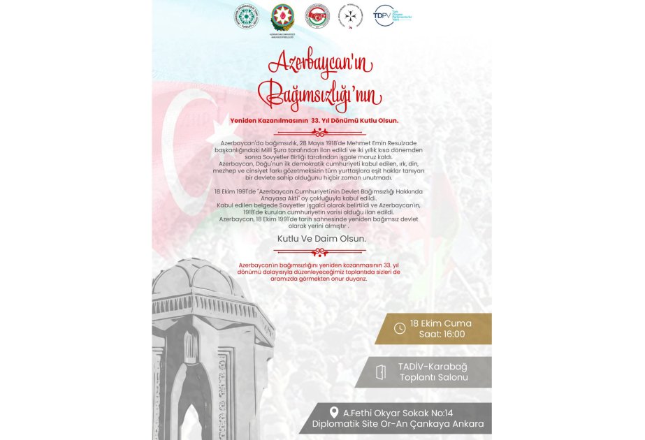 Oktyabrın 18-də Türkiyə paytaxtında Azərbaycanın Müstəqilliyinin Bərpası Gününə həsr edilmiş təntənəli mərasim olacaq.