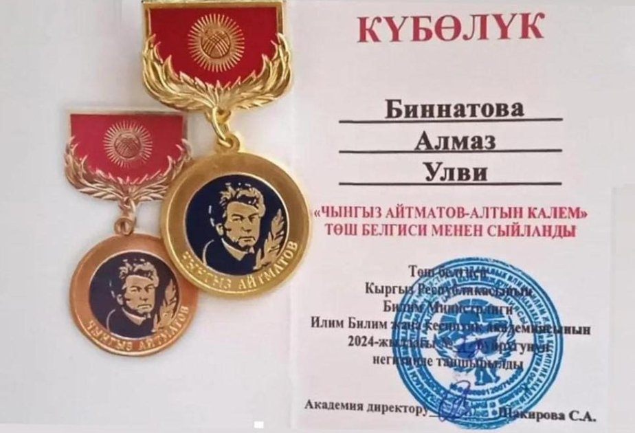 AMEA Nizami Gəncəvi adına Ədəbiyyat İnstitutunun şöbə müdiri filologiya elmləri doktoru Almaz Ülvü (Binnətova) Qırğız Respublikası Elm-Təhsil və Peşə Akademiyası tərəfindən “Çingiz Aytmatov” qızıl qələm medalı ilə təltif edilib.