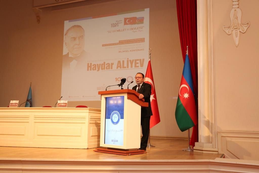 Qazi Universiteti rektoru Musa Yıldızın salamlarını çatdıran bu ali təhsil müəssisəsinin prorektoru Yücel Gelişli ortaq elmi konfransın əsas məqsədindən və önəmindən danışıb. Ulu Öndər Heydər Əliyevin qlobal liderlik keyfiyyətlərinə malik olduğunu vurğulayan prorektor görkəmli dövlət xadiminin çoxşaxəli, zəngin həyat və fəaliyyətində Türk Dünyasının xüsusi və mühüm yerə sahib olduğunu diqqətə çatdırıb. Bu il Türkiyə Respublikasının yaranmasının 100 illiyinin tamam olduğunu bildirən Y.Gelişli hər iki yüzilliyin sevincini özündə ehtiva edən belə bir tədbirə Qazi Universitetinin evsahibliyi etməsindən məmnunluğunu ifadə edib. İki universitet arasında əməkdaşlığın vacibliyindən bəhs edən Y.Gelişli MDU və Qazi Universiteti arasında müntəzəm olaraq təşkil edilən ortaq konfransların işbirliyinin inkişafına əhəmiyyətli töhfə verdiyini deyib, təşkilatçılara və məruzəçilərə təşəkkürünü bildirib.