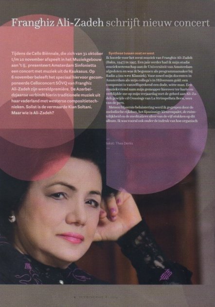 “Cello Biennale Amsterdam” festivalı haqqında məlumat verən çoxsaylı nəşrlər və musiqi jurnallarında Firəngiz Əlizadənin həyat və yaradıcılığına dair materiallar dərc olunub. Onu “müasir akademik musiqinin canlı klassiki” adlandırıblar. “De Nieuwe Muze” jurnalına müsahibəsində Firəngiz Əlizadə Azərbaycanın zəngin musiqi ənənələrindən, peşəkar musiqinin banisi Üzeyir Hacıbəylidən və onun bənzərsiz “Leyli və Məcnun” operasından danışır.