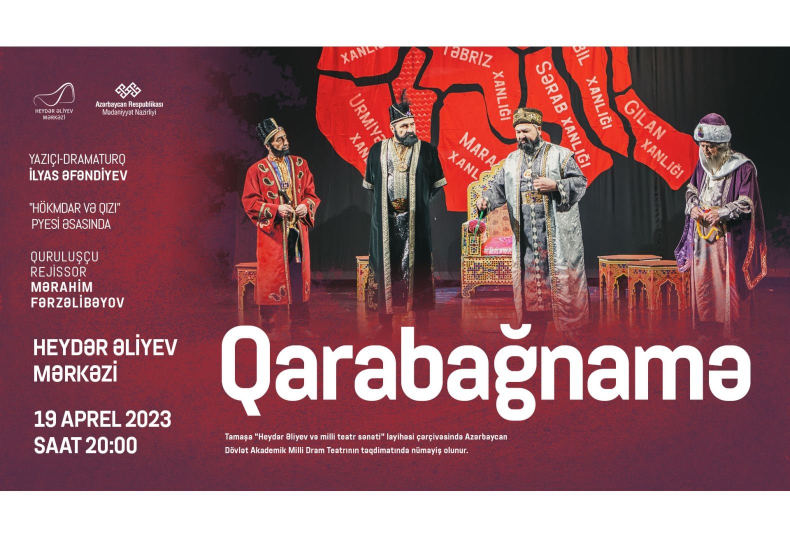 İlyas Əfəndiyevin “Hökmdar və qızı” pyesi əsasında hazırlanmış “Qarabağnamə” tamaşası isə ilk dəfə 2011-ci il martın 10-da nümayiş etdirilib və bu adla 79 dəfə təqdim olunub. “Qarabağnamə”nin Heydər Əliyev Mərkəzində 80-ci nümayişini izləmək üçün biletləri Mərkəzin kassası və iTicket.az saytı və satış məntəqələrindən əldə etmək olar.