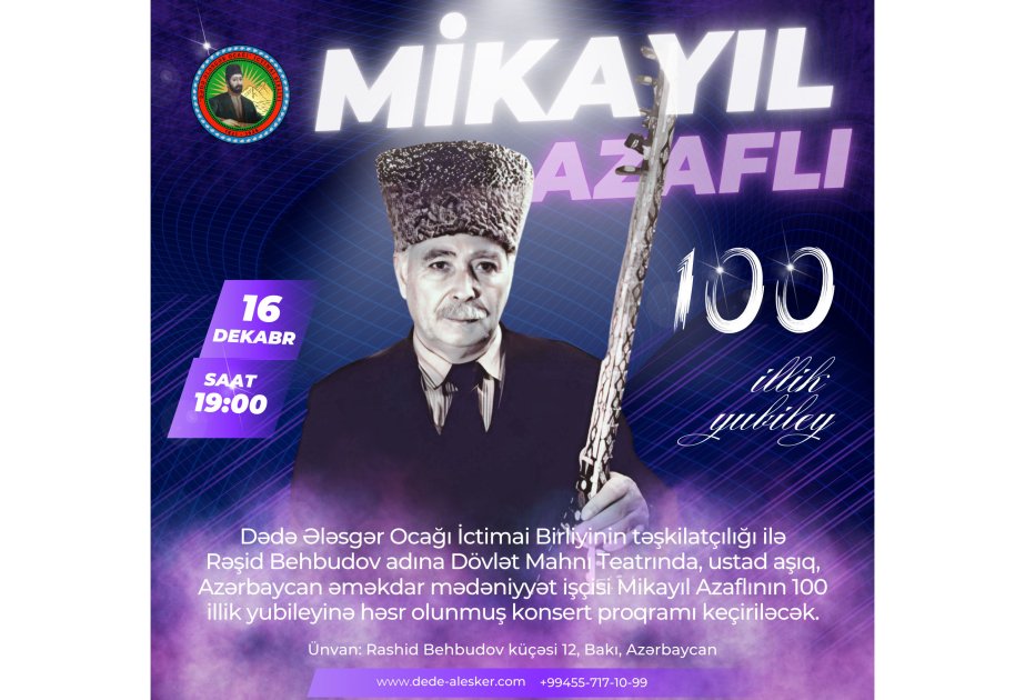 Dekabrın 16-da Rəşid Behbudov adına Mahnı Teatrında Azərbaycanın aşıq sənətinin görkəmli nümayəndələrindən biri olan Aşıq Mikayıl Azaflının 100 illik yubileyinə həsr edilmiş konsert keçiriləcək. Tədbir “Dədə Ələsgər Ocağı” İctimai Birliyi tərəfindən təşkil olunacaq.
