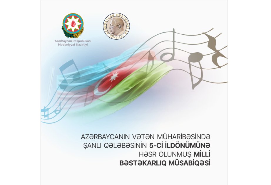 Mədəniyyət Nazirliyi Bəstəkarlar İttifaqı ilə birgə Vətən müharibəsində şanlı Qələbənin 5-ci ildönümünə həsr olunmuş Milli Bəstəkarlıq Müsabiqəsi elan edir.