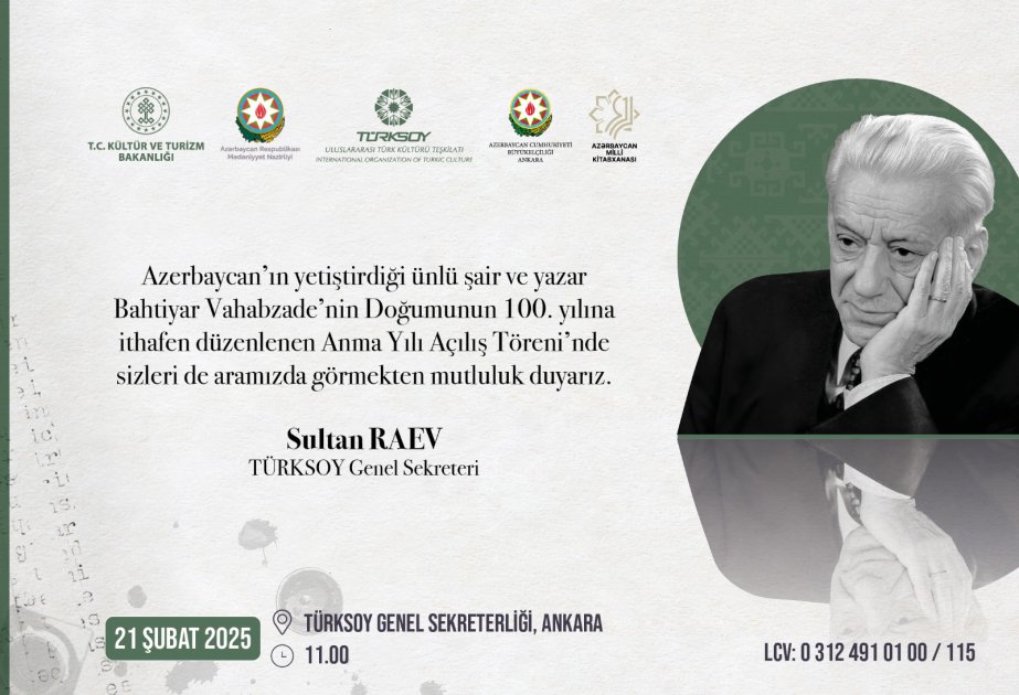 Azərbaycanın Beynəlxalq Türk Mədəniyyəti Təşkilatındakı (TÜRKSOY) nümayəndəsi Elçin Qafarlı AZƏRTAC-a bildirib ki, fevralın 21-də TÜRKSOY-un Ankaradakı baş ofisində “Bəxtiyar Vahabzadənin Anım İli”nin açılışı münasibətilə təntənəli tədbir keçiriləcək.