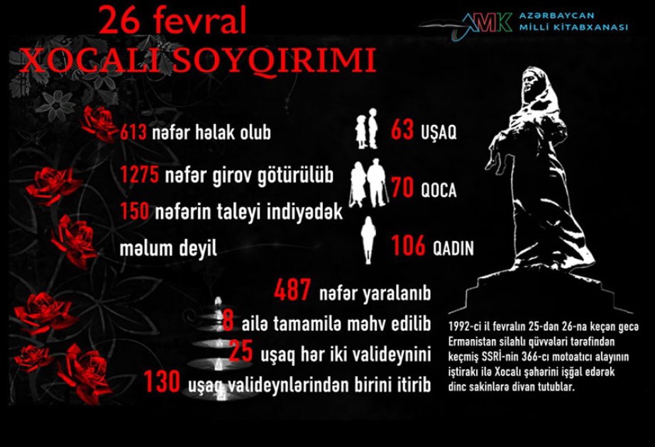 Milli Kitabxanada Azərbaycan xalqının tarixində və yaddaşında heç vaxt silinməyəcək və Xocalı faciəsi qurbanlarının xatirəsinə həsr olunmuş “26 fevral - Xocalı soyqırımı” adlı virtual sərgi onlayn rejimdə istifadəçilərə təqdim olunub.