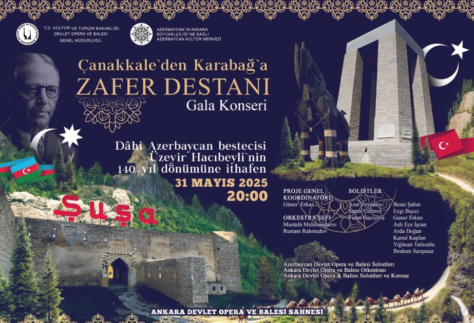 Mayın 31-də Ankara Dövlət Opera və Balet Teatrında dahi Azərbaycan bəstəkarı Üzeyir Hacıbəylinin anadan olmasının 140 illiyi ilə əlaqədar Azərbaycan-Türkiyə opera sənətçilərinin iştirakı ilə “Zəfər dastanı: Çanaqqaladan Qarabağa” adlı qala-konsert keçiriləcək.