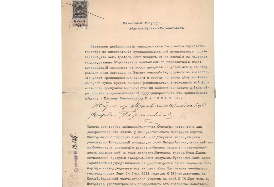 Zamanla azacıq yıpranan qalın vərəqdə notariat qaydasında təsdiq edilmiş mətn var ki, onun əsasında Əbdül Müslüm Maqomayev Üzeyir Hacıbəylinin adından bunları edə bilərdi: “...Mənə məxsus musiqi əsərlərinin istismarı üzrə səlahiyyətə malik olsun...bu məqsədlə müxtəlif müqavilələr bağlasın, öz mülahizəsi ilə, şərtlərlə və qiymətlə bu işin pulunu mənim üçün alsın, ümumiyyətlə, mənim adıma imza atılmalı və qanunun tələb etdiyi bütün rəsmiyyətlərin yerinə yetirilməli olacağı bu məsələdə məni əvəz etsin. Qanuni vəzifələri yerinə yetirməyiniz üçün Sizə güvənirəm, mübahisə etməyəcəyəm və sizə zidd olmayacağam”.