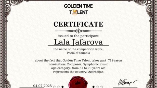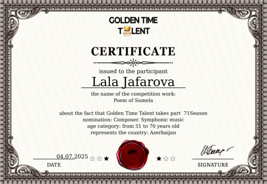 Bəstəkar Lalə Cəfərova Londonda keçirilən “Golden Time Talent” müsabiqəsinə göndərdiyi simfonik orkestr üçün “Sumela” poemasına görə I yerə layiq görülərək diplom və sertifikatla təltif olunub.