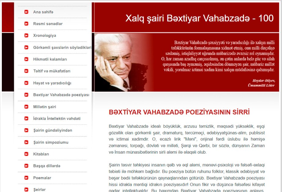 “Xalq şairi Bəxtiyar Vahabzadə 100” adlı bazada akademik Nizami Cəfərovun “Bəxtiyar Vahabzadə yaxud millətin şairi”, türkoloq, filologiya elmləri doktoru Nizami Məmmədov Tağısoyun “Bəxtiyar Vahabzadə poeziyasında idrakla intellektin vəhdəti” kimi məqalələrin tam mətni ilə yanaşı, şairin sözlərinə yazılmış bəstələrin, notların siyahıları, “Bəxtiyar Vahabzadə simpoziumu”, “Bəxtiyar Vahabzadənin gündəliyindən”, “Tərcümələr”, “Dissertasiya və avtoreferatlar”, “Virtual sərgi”, “Foto və video qalereya”, “Xatirəsinin əbədiləşdirilməsi” kimi bölmələr də mövcuddur.