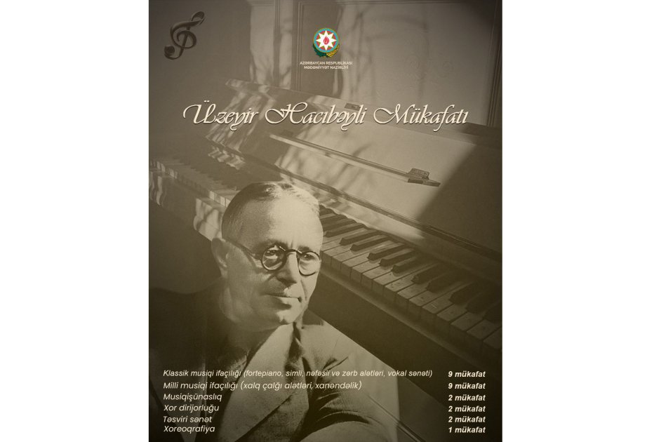 Azərbaycan musiqi mədəniyyətinin banisi, böyük bəstəkar, musiqişünas, publisist, dramaturq və pedaqoq, akademik Üzeyir Hacıbəylinin 140 illik yubileyi münasibətilə Mədəniyyət Nazirliyi və Mədəniyyət İşçiləri Həmkarlar İttifaqı musiqi və incəsənət təhsili müəssisələrində çalışan təhsilverənlər arasında “Üzeyir Hacıbəyli mükafatı” müsabiqəsi elan edib.