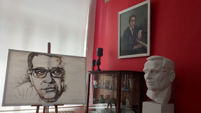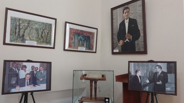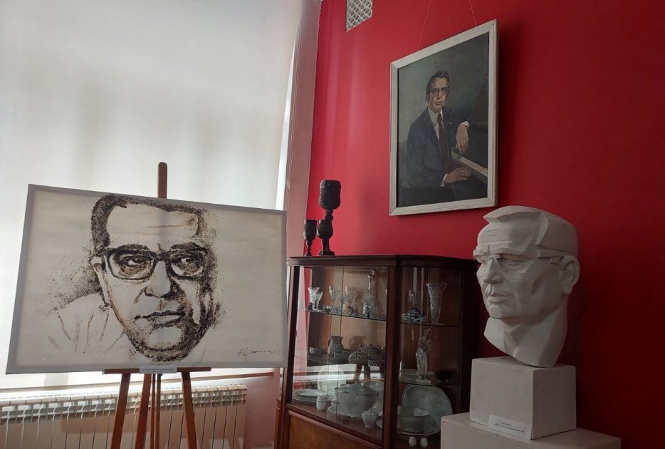 Azərbaycanın görkəmli bəstəkarı Qara Qarayevin kətan üzərində çəkilmiş möhtəşəm və bir o qədər də qeyri-adi portretini görürəm. Portretin qeyri-adiliyi onun sadəcə quru çay və yapışqandan istifadə olunaraq ərsəyə gətirilməsindədir. Əsər rəssam Ramil Qasımovun əl işidir. Qara Qarayevə məxsus stol və stul dəsti, şkaflar və büst də burada nümayiş olunur. Bələdçi deyir ki, 2018-ci ildə Q.Qarayevə aid şəxsi əşyaların böyük bir qismi dahi bəstəkarın 100 illiyi münasibətilə açılmış mənzil-muzeyinə köçürülüb. Həmçinin Üzeyir Hacıbəyli, Cövdət Hacıyev, Niyazi, Fikrət Əmirov, Sultan Hacıbəyli və Asəf Zeynallı kimi dəyərli bəstəkarlarımızın şəkilləri otağın divarlarını bəzəyir.