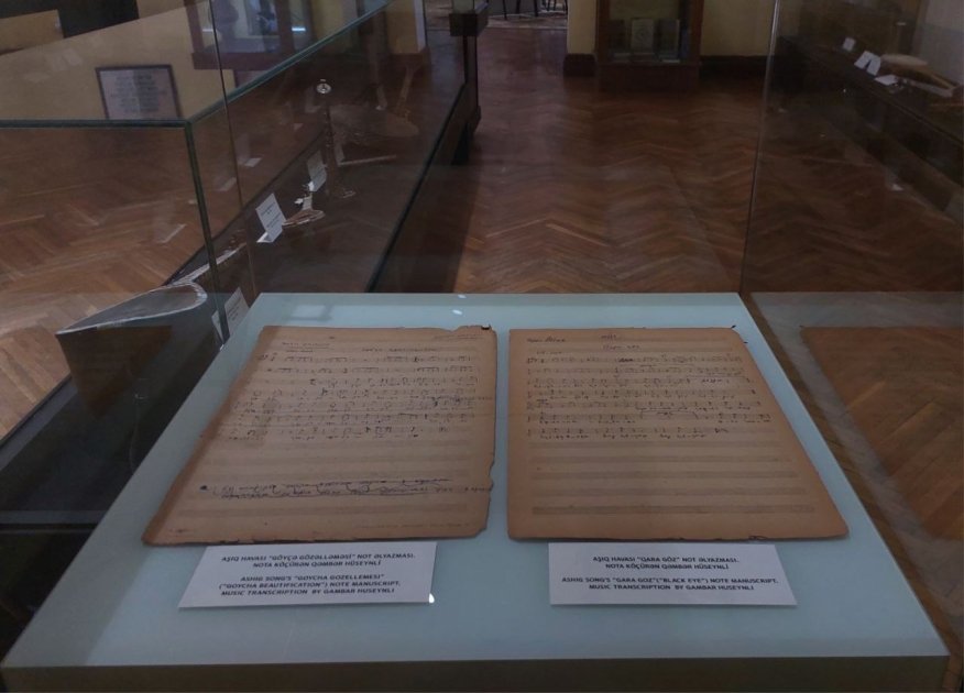 Tükənməz xalq yaradıcılığı çeşməsindən süzülüb gələn təkrarsız sənət nümunələri ilə tanınan Aşıq Ələsgərin 200 illiyi münasibətilə hazırlanmış otağa keçirik. Burada böyük, orta və kiçik saz nümunələri, həmçinin sazla birlikdə ifa olunan qoşa nağara, nağara, zurna, balaban kimi eksponatlar nümayiş olunur. Aşıq yaradıcılığı şifahi xalq ədəbiyyatının bir hissəsidir. Aşıqlar çıxış edərkən heç bir yazılı mənbədən istifadə etmirlər. Lakin bəzi musiqilər var ki, illər keçdikcə unudulur və ya ilkin formasını itirir. Məhz bu səbəbə görə bəstəkar Qənbər Hüseynli bəzi aşıq musiqilərinin notlarını əlyazma halına salıb. Həmin bu notlar muzeyin ekspozisiyasında dəyərli sənət nümunələri kimi qorunub saxlanılır. Həmçinin bu otaqda Aşıq Barat, Aşıq Xanlar, Aşıq Sabir kimi aşıqların musiqi alətlərini, Aşıq Hüseyn Saraçlıya məxsus olan papaq, çəkmə və kəməri də görmək mümkündür.