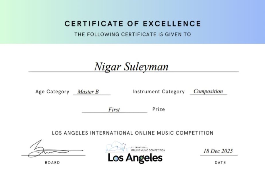 Gənc bəstəkar Nigar Süleyman Los-Ancelesdə keçirilən beynəlxalq onlayn musiqi müsabiqəsində uğura imza atıb.