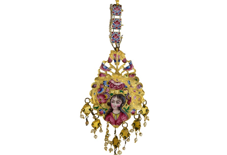 Bu dekorativ əsərin arxa tərəfi, çiçək aranjimanı ilə əhatə olunub, Şərq qadın gözəlliyinin rəmzi olan ayüzlü bir qızı təsvir edir. Qacar zərgərlik məmulatlarında qadın obrazları təkcə estetik baxımdan xoş deyil, həm də zərif cinsin gözəlliyi, qadınların cəmiyyətdəki rolu və XIX əsr İranında incəsənətin yeri haqqında fikirlərin tarixi güzgüsüdür. Bu obrazlar poeziyanı, simvolizmi, lüksü və sirri birləşdirərək qiymətli metallarda və daşlarda keçmiş dövrün ruhunu qoruyur. Müxtəlif mədəniyyətlərdə qadının zərgərlik məmulatlarında çöhrəsi poetik xəyalların obrazı, idealın əksi və səssiz bir mesajdır. Əsrlər boyu bu gözəllik kolleksiyaçıların əlləri, muzey vitrini vasitəsilə bizə çatır və təkcə keçmişin şahidi kimi deyil, onun nəfəsi kimidir.