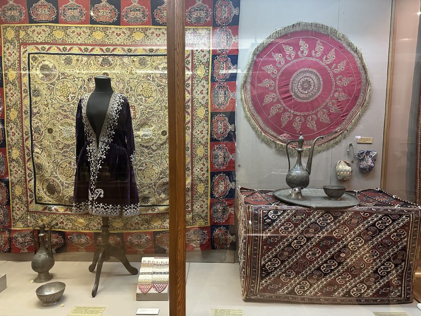Mariya Filatovanın sözlərinə görə, 1918-ci ildə fəaliyyətə başlayan muzey “Ars Asiatica” adlanırdı: “O zaman açılan inventar kitabında məhz Qarabağ qrupuna aid XIX əsr Azərbaycan xalçası birinci xalça kimi qeyd olunub. Zaman keçdikcə muzeyin kolleksiyası xeyli genişlənib. Azərbaycana aid eksponatlar həm tamaşaçılar, həm də bizim üçün – elmi əməkdaşlar və tədqiqatçılar üçün çox maraqlıdır, çünki onlar azərbaycanlıların müxtəlif dövrlərdə həyat tərzini əks etdirir”. Muzeyin daimi ekspozisiyasının Qafqaz zalında Azərbaycana həsr olunmuş ayrıca guşə var. Burada xalçalar, mis üzərində döymə üsulu ilə hazırlanmış məmulatlar və tikmələr nümayiş etdirilir. Maraqlı eksponatlardan biri də XIX əsrə aid səfir süfrəsidir. “Əslində bu cür süfrələr masa örtüyü kimi istifadə olunmurdu. Onlar hörmətli qonaqlara hədiyyə edilirdi, hədiyyələr həmin süfrələrə bükülürdü. Yəni bu, bir növ diplomatik ənənənin elementi idi”, - deyə Maiya Filatova bildirib. O əlavə edib ki, səfir süfrələrinin hazırlanma üsulu olduqca mürəkkəb idi: “Onları kişilər tikirdilər. Çünki süfrələrin tikilməsində qızıl saplardan istifadə olunurdu və hesab edilirdi ki, qadın əlinin toxunuşundan qızıl solur”.