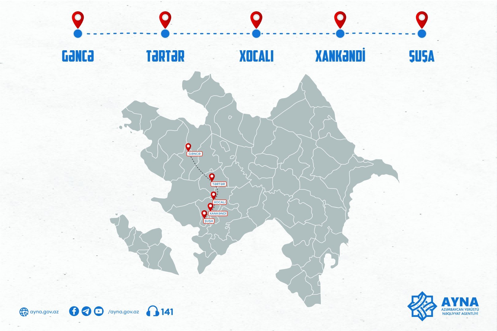 Bildirilib ki, Azərbaycan Yerüstü Nəqliyyat Agentliyi (AYNA) tərəfindən 28 fevral tarixindən Gəncədən Şuşa şəhərinə müntəzəm avtobus reysi istifadəyə veriləcək.