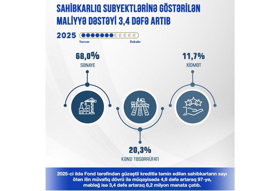 Fond tərəfindən verilmiş ümumi güzəştli kredit məbləğinin 68,0 faizi sənaye, 20,3 faizi kənd təsərrüfatı məhsullarının istehsalı, 11,7 faizi xidmət sahələrinə yönəldilib.