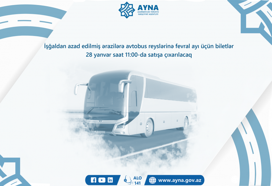 Azərbaycan Yerüstü Nəqliyyat Agentliyinin (AYNA) işğaldan azad olunmuş ərazilərə təşkil etdiyi müntəzəm avtobus reyslərinə fevral ayı üçün biletlər 28 yanvar saat 11:00-da satışa çıxarılacaq.