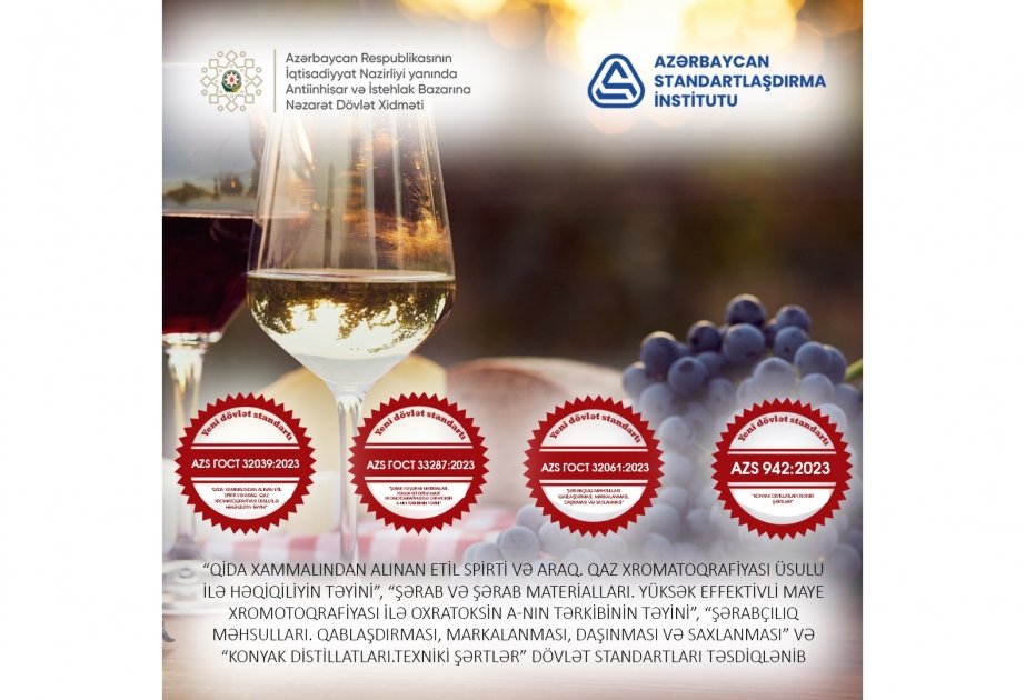Azərbaycan Standartlaşdırma İnstitutu (AZSTAND) tərəfindən AZS ГОСТ 32039:2023 “Qida xammalından alınan etil spirti və araq. Qaz xromatoqrafiyası üsulu ilə həqiqiliyin təyini”, AZS ГОСТ 33287:2023 “Şərab və şərab materialları. Yüksək effektivli maye xromotoqrafiyası ilə oxratoksin A-nın tərkibinin təyini”, AZS ГОСТ 32061:2023 “Şərabçılıq məhsulları. Qablaşdırması, markalanması, daşınması və saxlanması” və AZS 942:2023 (ГОСТ 31728-2014) “Konyak distillatları.Texniki şərtlər” yeni dövlət standartları qəbul edilib.