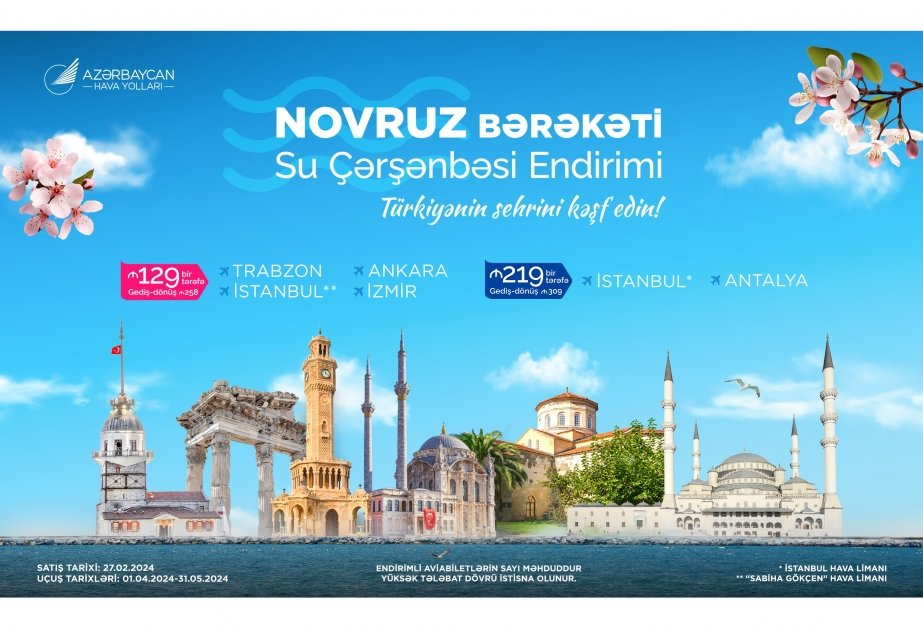 "Azərbaycan Hava Yolları" QSC-nin mətbuat xidmətindən AZƏRTAC-a bildirilib ki, təklif çərçivəsində Türkiyənin 5 şəhərinə endirimli qiymətlərlə aviabilet əldə etmək mümkündür: İstanbul (İstanbul və “Sabiha Gökçen” hava limanları), Antalya, Ankara, İzmir və Trabzon.