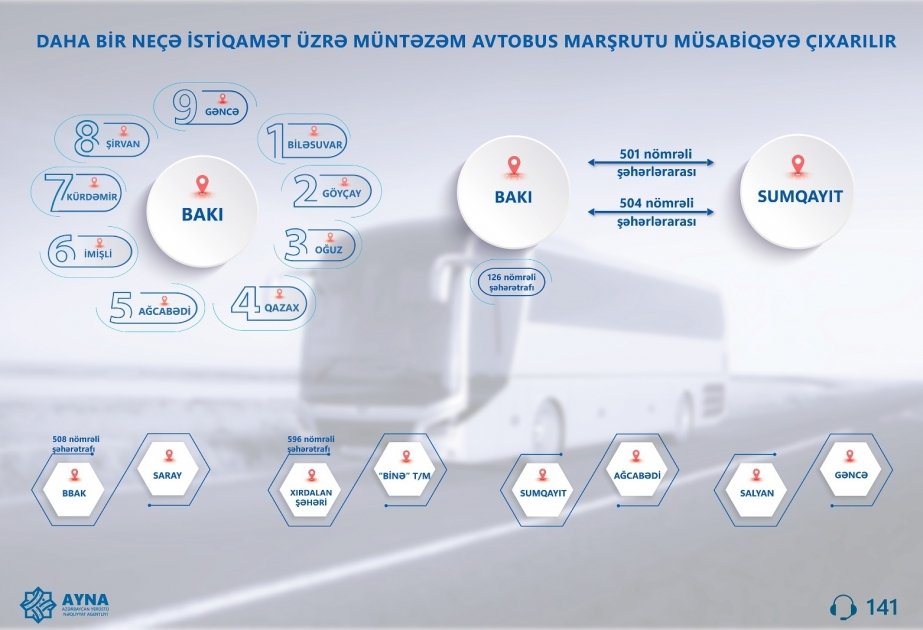 Azərbaycan Yerüstü Nəqliyyat Agentliyi (AYNA) sərnişindaşıma xidmətinin keyfiyyətinin artırılması ilə bağlı tədbirlər çərçivəsində Bakı-Biləsuvar, Bakı-Göyçay, Bakı-Oğuz, Bakı-Gəncə, Bakı-Ağcabədi, Bakı-Kürdəmir, Bakı-Qazax, Bakı-İmişli, Bakı-Şirvan, Salyan-Gəncə, Sumqayıt-Ağcabədi şəhərlərarası, paytaxtın 126 nömrəli şəhərətrafı, 501 və 504 nömrəli şəhərlərarası, eləcə də 508 və 596 nömrəli şəhərətrafı müntəzəm avtobus marşrutlarını müsabiqəyə çıxarır.