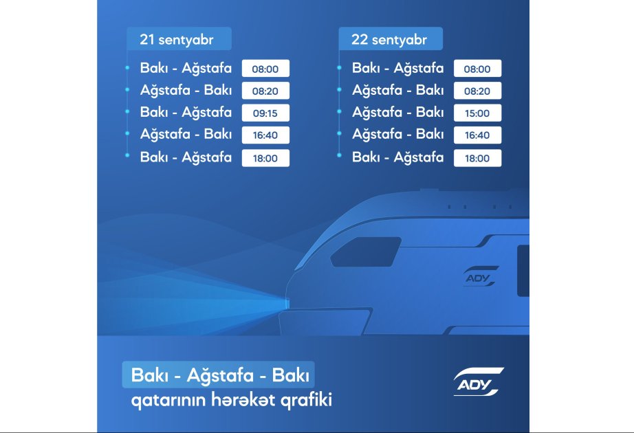 Azərbaycan Dəmir Yollarının (ADY) sərnişin tələbatını təmin etmək məqsədilə sentyabrın 21 və 22-də Bakı-Ağstafa-Bakı marşrutu üzrə əlavə qatar reysləri təyin edir.