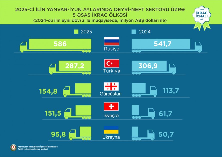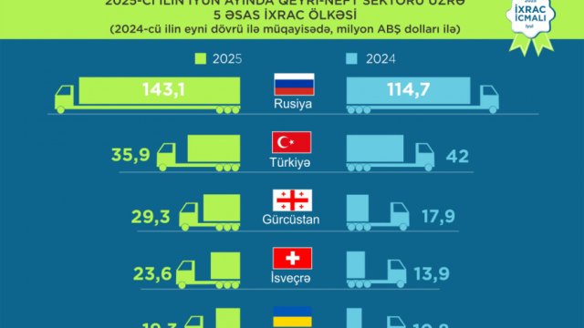 2025-ci ilin iyun ayında Rusiyaya 143,1 milyon dollar, Türkiyəyə 35,9 milyon dollar, Gürcüstana 29,3 milyon dollar, İsveçrəyə 23,6 milyon dollar, Ukraynaya isə 19,3 milyon dollar dəyərində qeyri-neft sektoruna aid mal ixrac edilib.