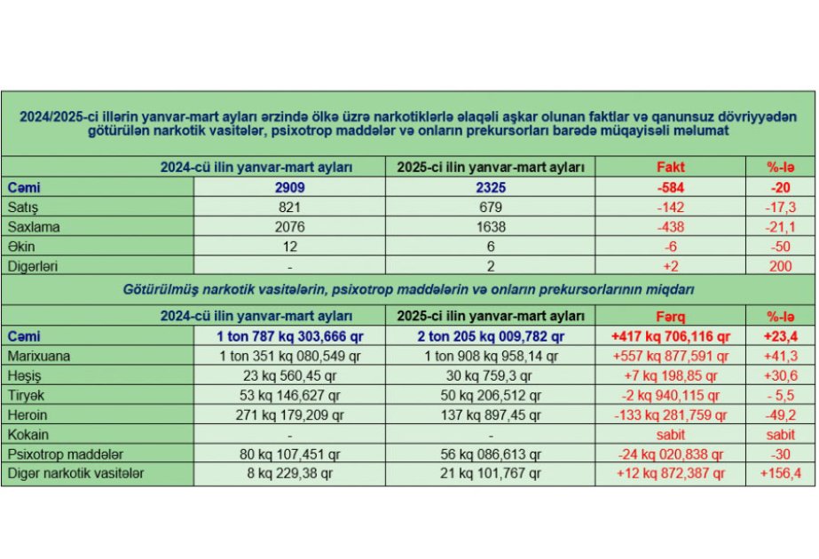 Aşkarlanmış faktlar üzrə qanunsuz dövriyyədən ümumilikdə müsadirə olunmuş 2 ton 205 kiloqram 9,782 qram narkotik vasitələrin və psixotrop maddələrin1 ton 908 kiloqram 958,14 qramını marixuana, 137 kiloqram 897,45 qramını heroin, 50 kiloqram 206,512 qramını tiryək, 30 kiloqram 759,3 qramını həşiş, 21 kiloqram 101,767 qramını digər narkotik vasitələr və 56 kiloqram 86,613 qramını psixotrop maddələr təşkil edib. Həmçinin həmin dövr ərzində 2174 ədəd metadon, 15 ədəd çətənə bitkisi qanunsuz dövriyyədən götürülüb.