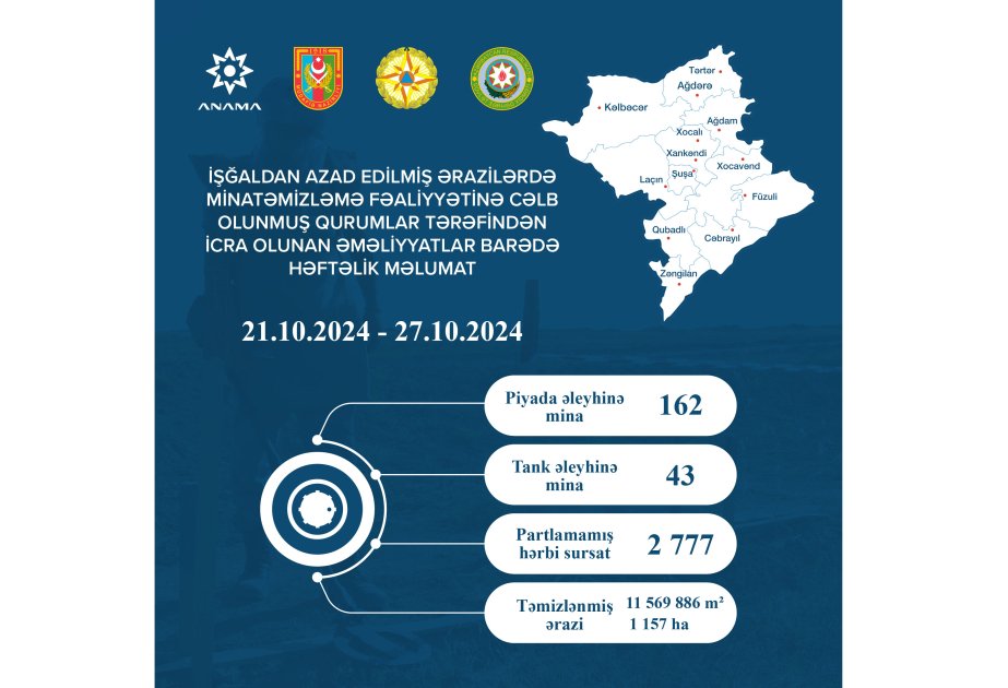 ANAMA-dan AZƏRTAC-a bildirilib ki, oktyabrın 21-dən 27-dək Tərtər, Ağdərə, Kəlbəcər, Ağdam, Xocalı, Xankəndi, Xocavənd, Laçın, Şuşa, Füzuli, Qubadlı, Cəbrayıl və Zəngilan ərazilərində aparılmış minatəmizləmə əməliyyatları zamanı piyadaəleyhinə 162, tankəleyhinə 43 mina və 2777 partlamamış hərbi sursat aşkarlanaraq zərərsizləşdirilib.