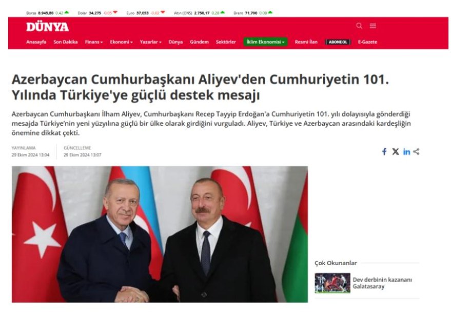 Türkiyənin aparıcı telekanalları, qəzetləri, informasiya agentlikləri və xəbər saytları Prezident İlham Əliyevin qardaş ölkədə Respublika Günü elan edilməsinin 101-ci ildönümü münasibətilə təbrikini geniş işıqlandırıb.