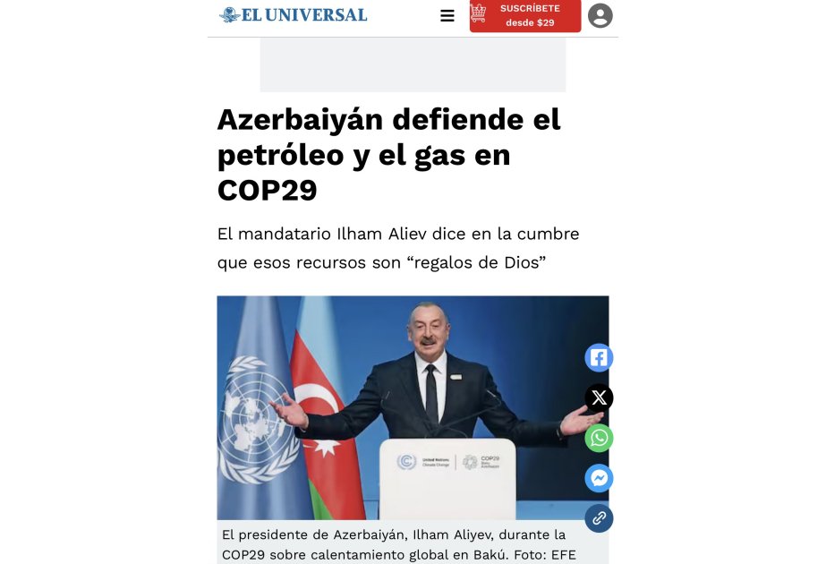 Meksikanın geniş oxuyucu kütləsinə malik olan və ölkənin ən nüfuzlu “El Universal” qəzetində ölkəmizin ev sahibliyi etdiyi BMT-nin İqlim Dəyişmələri üzrə Çərçivə Konvensiyasının Tərəflər Konfransının 29-cu sessiyası (COP29) ilə bağlı məqalə dərc edilib.
