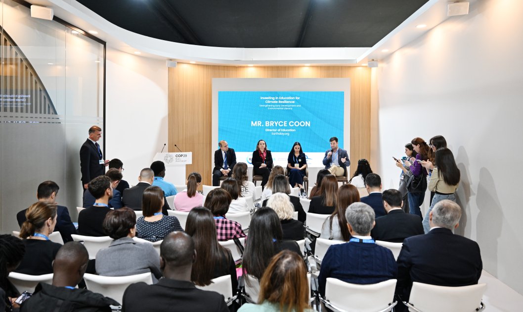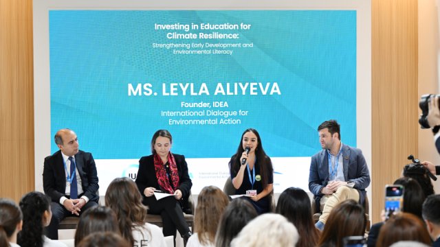 Heydər Əliyev Fondunun vitse-prezidenti, IDEA (Ətraf Mühitin Mühafizəsi Naminə Beynəlxalq Dialoq) İctimai Birliyinin təsisçisi və rəhbəri Leyla Əliyeva Beynəlxalq Təbiəti Mühafizə İttifaqı (BTMİ) və IDEA İB-nin birgə təşkilatçılığı ilə BMT-nin İqlim Dəyişmələri üzrə Çərçivə Konvensiyasının Tərəflər Konfransının 29-cu sessiyası (COP29) çərçivəsində həyata keçirilən “İqlim dayanıqlığı üçün təhsilə investisiya: erkən inkişaf və ətraf mühit savadlılığının artırılması” mövzusunda müzakirələrdə iştirak edib.
