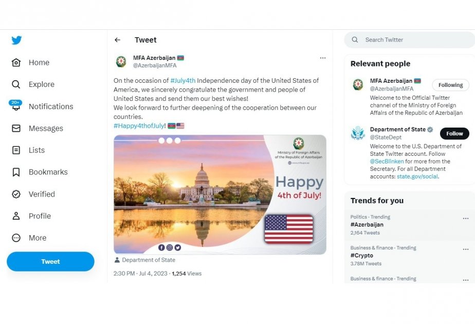 Azərbaycanın Xarici İşlər Nazirliyi ABŞ-ı Müstəqillik Günü münasibətilə təbrik edib.
