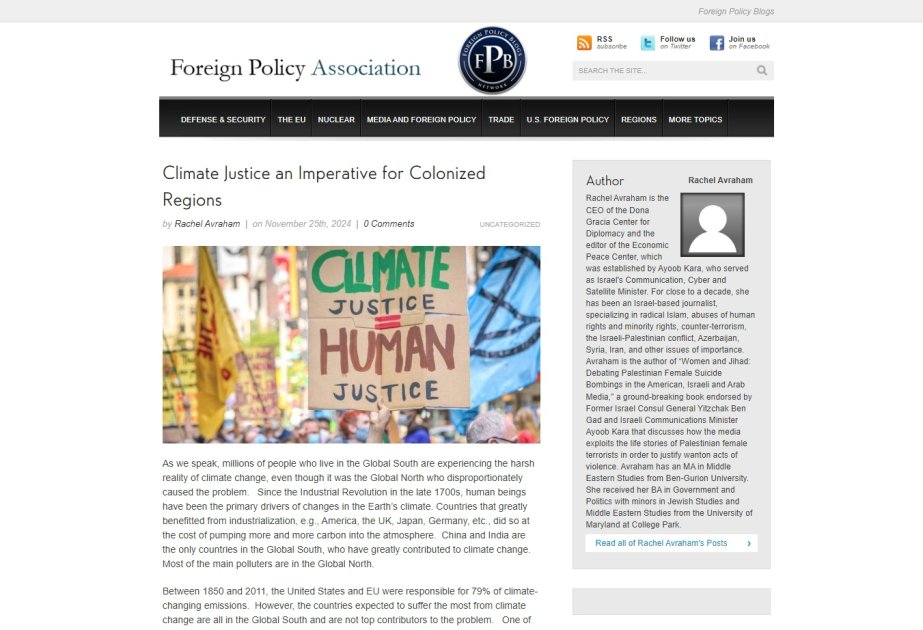 Tanınmış politoloq və jurnalist, Dona Qrasiya Diplomatiya Mərkəzinin təsisçisi və baş direktoru Reyçel Avraham baş qərargahı Nyu-Yorkda yerləşən Xarici Siyasət Assosiasiyasının xəbər saytında dərc olunmuş “Müstəmləkə bölgələr üçün iqlim ədaləti vacib şərtdir” başlıqlı məqaləsində Fransa və digər Avropa dövlətlərinin müstəmləkə istismarının ekoloji fəsadlarından yazıb.