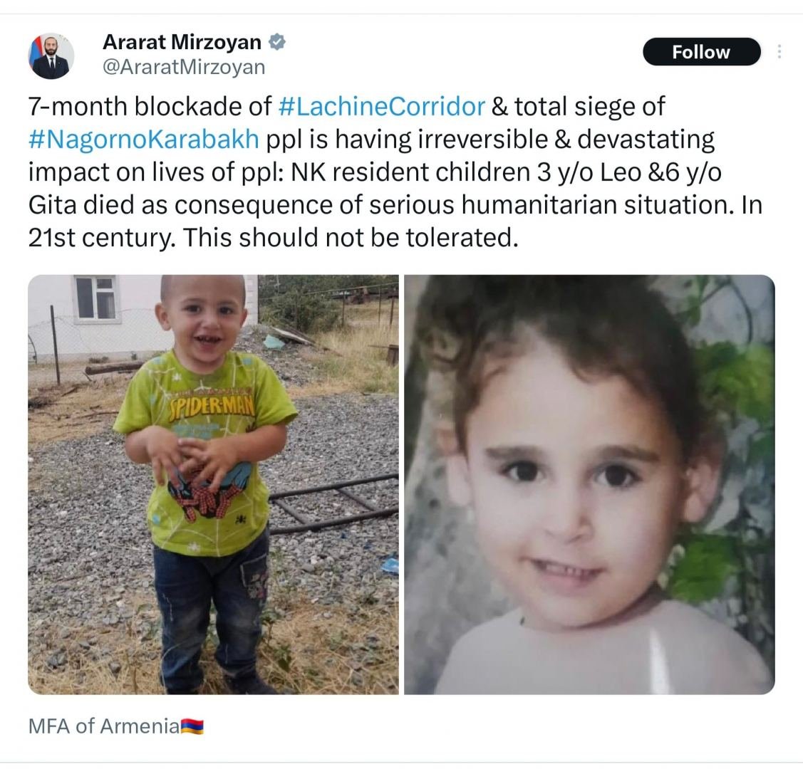 Trend-in cümə axşamı verdiyi məlumata görə, bunu Azərbaycan Prezidentinin köməkçisi, Prezident Administrasiyasının Xarici siyasət məsələləri şöbəsinin müdiri Hikmət Hacıyev öz "Twitter" səhifəsində Ermənistan xarici işlər naziri Ararat Mirzoyanın Azərbaycanın “blokadası” nəticəsində öldüyü iddia edilən erməni uşaqlarla bağlı təxribat xarakterli paylaşıma cavab olaraq yazıb.