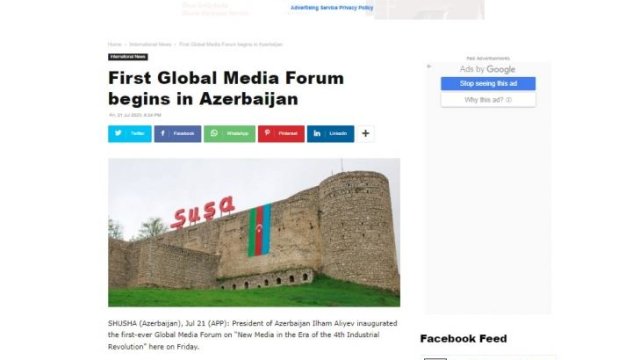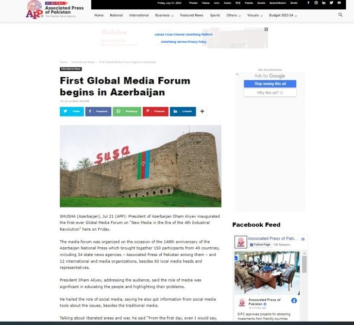 Trend xəbər verir ki, Pakistanın rəsmi “Associated Press of Pakistan” agentliyi Azərbaycan Prezidenti İlham Əliyevin Forumda çıxışından əsas məqamları dərc edib. Agentliyin materialında diqqətə çatdırılıb ki, Azərbaycan Milli Mətbuatının 148-ci ildönümü ilə bağlı keçirilən Forumda 49 ölkədən 150 xarici qonaq, o cümlədən dünyanın 34 ölkəsinin dövlət informasiya agentliyi, 12 beynəlxalq təşkilat və media qurumu, 60 yerli media rəhbəri və nümayəndəsi iştirak edir.