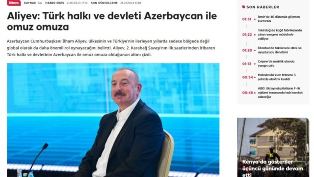 Pakistanın informasiya agentliyi vurğulayıb ki, işğaldan azad olunmuş ərazilər və müharibə məsələlərinə toxunan Prezident İlham Əliyev deyib: “İkinci Qarabağ müharibəsinin ilk saatlarından Türkiyə rəhbərliyi ilə xalqı bizimlə çiyin-çiyinə dayanmışdı. Prezident Ərdoğanın Qarabağ müharibəsinin ilk saatlarında verdiyi bəyanat ki, Azərbaycan yalnız deyil, - bu, bizim üçün çox böyük dəstək idi”.