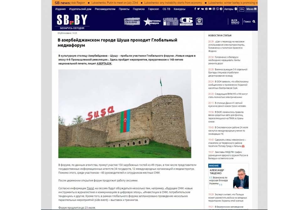 “Belarus seqodnya” nəşri öz xəbərində yazıb ki, Azərbaycanın mədəniyyət paytaxtı Şuşa şəhəri Azərbaycan Milli Mətbuatının 148-ci ildönümü ilə bağlı keçirilən Forumda dünyanın müxtəlif ölkələrindən media nümayəndələrini bir araya toplayıb. Bu mötəbər tədbirdə 49 ölkədən 150 xarici qonaq, o cümlədən dünyanın 34 ölkəsinin dövlət informasiya agentliyi, 12 beynəlxalq təşkilat və media qurumu, 60 yerli media rəhbəri və nümayəndəsi iştirak edir. Rəsmi açılış mərasimindən sonra Forum işini sessiyalarda davam etdirəcək, rəqəmsal dövrdə jurnalistika və kommunikasiyada yeni alətlər, rəqəmsal transformasiya, müasir informasiya mühitində media menecmenti və dayanıqlı media biznes modellərinin yaradılması, yeni mediada istehlak tendensiyaları və media savadlılığı, dezinformasiya və feyk nyusla mübarizə üsulları, jurnalistlərin təhlükəsizliyi və digər məsələləri müzakirə olunacaq.