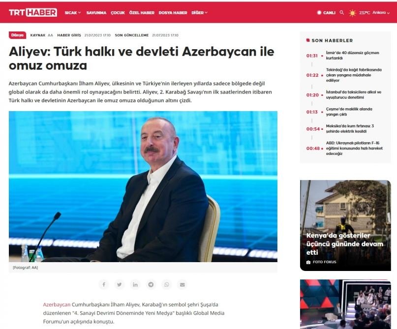 Prezident İlham Əliyevin Forumdakı çıxışı qardaş Türkiyənin “TRTHaber”, “Takvim”, “Yeni Şafak”, “HaberGlobal”, “Milliyet, “Anadolu” agentliyi, “CNN Türk” və başqa telekanal, agentlik, qəzet və portalları tərəfindən geniş işıqlandırılıb. Bu media orqanları dövlətimizin başçısının söylədiyi “İkinci Qarabağ müharibəsinin ilk saatlarından Türkiyə rəhbərliyi ilə xalqı bizimlə çiyin-çiyinə dayanmışdı. Prezident Ərdoğanın Qarabağ müharibəsinin ilk saatlarında verdiyi bəyanat ki, Azərbaycan yalnız deyil, - bu, bizim üçün çox böyük dəstək idi” fikirlərini ön plana çıxarıblar.