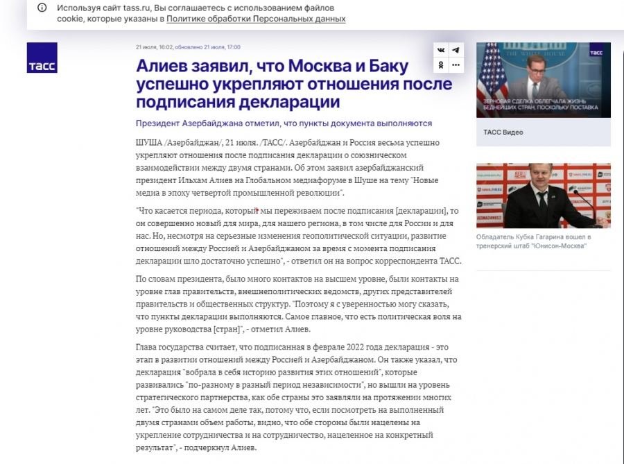 Bu nəşrdə, həmçinin Azərbaycan Prezidenti İlham Əliyevin çıxışında Rusiya-Azərbaycan münasibətləri barədə söylədiyi fikirlər də yer alıb. Qeyd olunub ki, dövlət başçısı Moskva ilə münasibətlərin strateji tərəfdaşlıq səviyyəsində olduğunu, həmçinin konkret nəticələrə əsaslandığını bildirib.