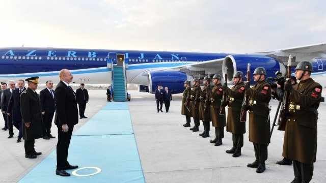Trend xəbər verir ki, hər iki ölkənin Dövlət bayraqlarının dalğalandığı Ankaranın Esenboğa hava limanında dövlətimizin başçısının şərəfinə fəxri qarovul dəstəsi düzülmüşdü.