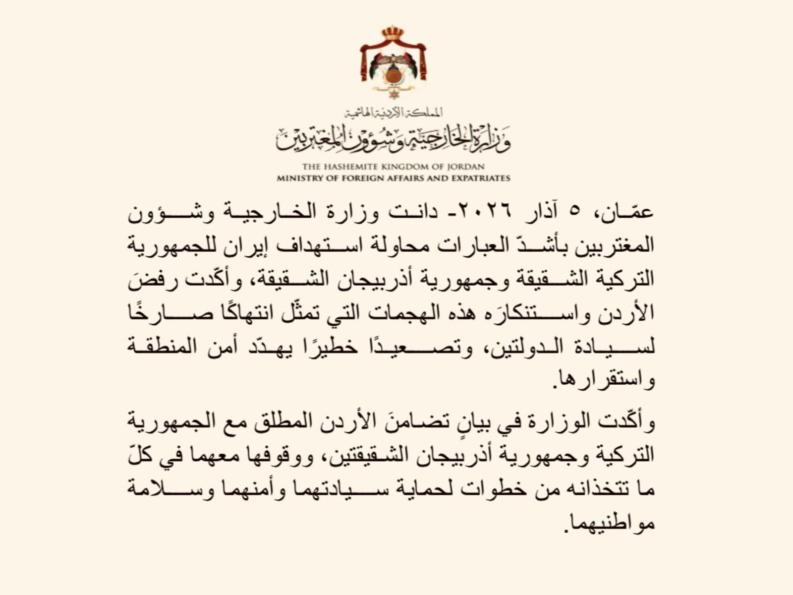 İordaniyanın Xarici İşlər və Xaricdə Yaşayanlarla İş üzrə Nazirliyi İranın qardaş Türkiyə Respublikasına və qardaş Azərbaycan Respublikasına qarşı hücum cəhdini ən sərt ifadələrlə pisləyir.