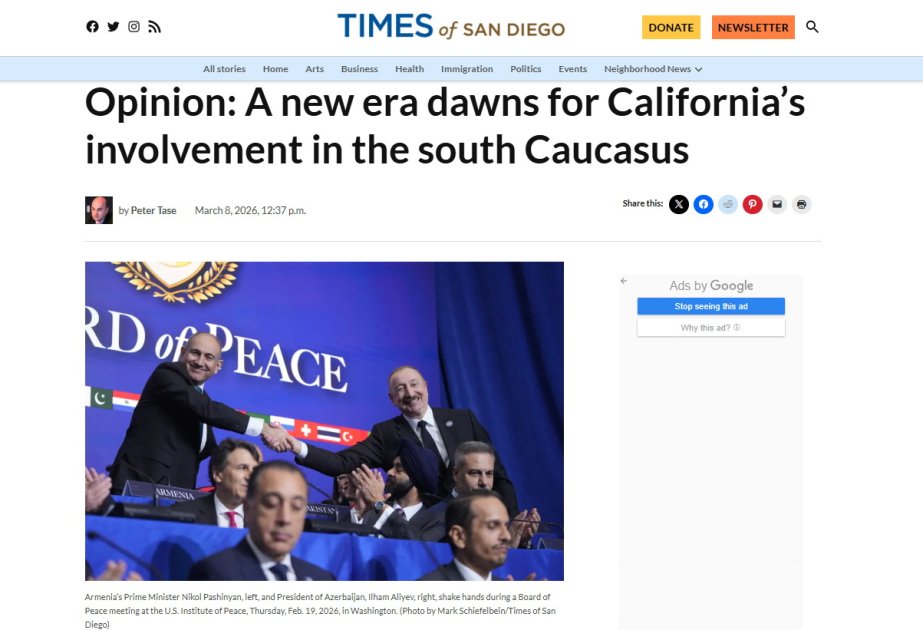 ABŞ-də fəaliyyət göstərən “Times of San Diego” nəşrində “Opinion: A new era dawns for California’s involvement in the South Caucasus” (“Kaliforniyanın Cənubi Qafqazda iştirakında yeni dövr başlayır”) başlıqlı məqalə dərc olunub. AZƏRTAC xəbər verir ki, yazının müəllifi politoloq və beynəlxalq münasibətlər üzrə ekspert Piter Teysdir. O, Kaliforniyanın və ümumilikdə ABŞ-nin Cənubi Qafqaz regionundakı rolunun dəyişməsi və yeni imkanların yaranması barədə fikirlərini bölüşüb. Piter Teys qeyd edir ki, son illərdə ABŞ-nin regionda diplomatik fəallığının artması Cənubi Qafqazda yeni siyasi mərhələnin başlanğıcını göstərir. Onun fikrincə, 2025-ci ilin avqustunda Vaşinqtonun vasitəçiliyi ilə Azərbaycan və Ermənistan liderləri arasında aparılan danışıqlar uzunmüddətli münaqişənin həlli istiqamətində mühüm dönüş nöqtəsi olub. Müəllif bunu ABŞ diplomatiyasının real nəticəyönümlü addımı kimi qiymətləndirir.