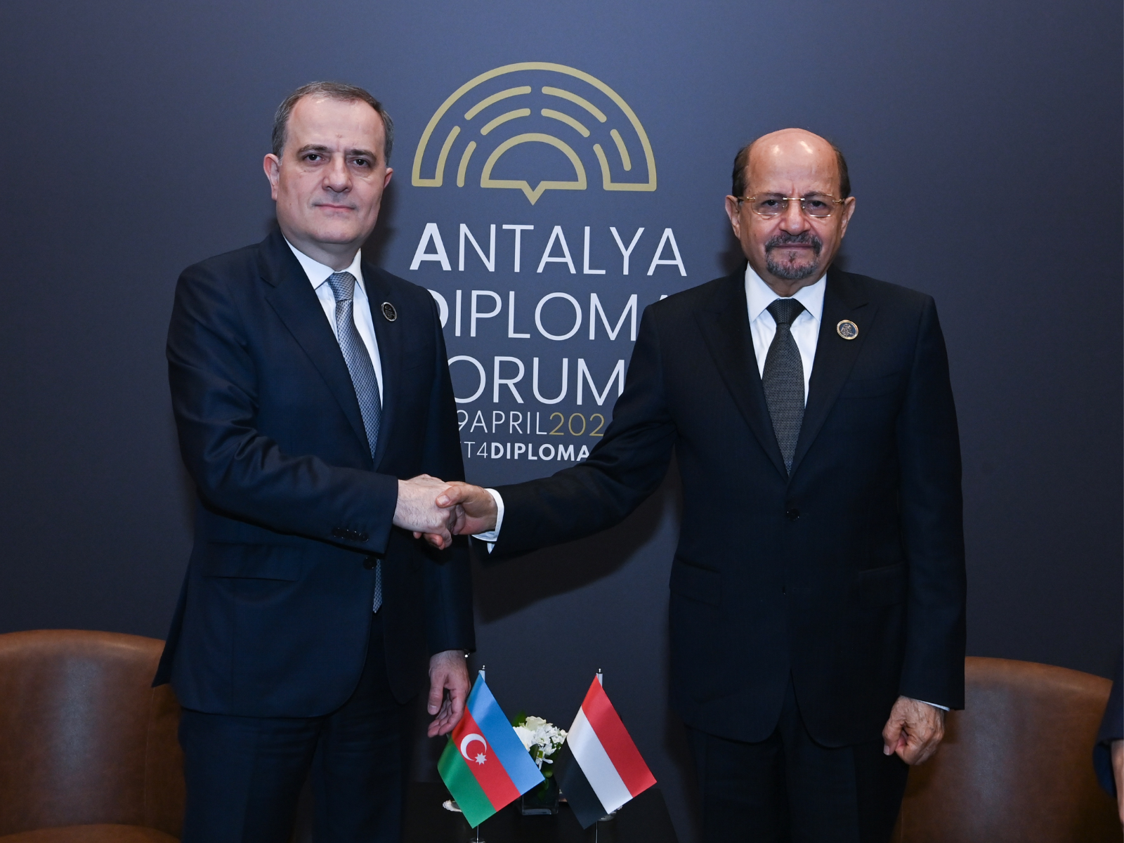 Azərbaycanın xarici işlər naziri Ceyhun Bayramov Antalya Diplomatiya Forumu çərçivəsində Yəmənin Baş naziri, xarici işlər və xaricdə yaşayan vətəndaşlarla iş üzrə naziri Şaya Mohsin Zindani ilə görüşüb.