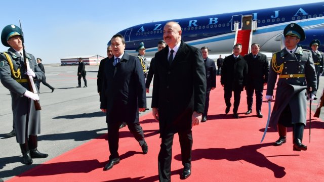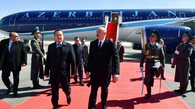 DHA Press xəbər verir ki, hər iki ölkənin Dövlət bayraqlarının dalğalandığı Astana şəhərinin Nursultan Nazarbayev Beynəlxalq Aeroportunda Azərbaycan Prezidentinin şərəfinə fəxri qarovul dəstəsi düzülmüşdü.